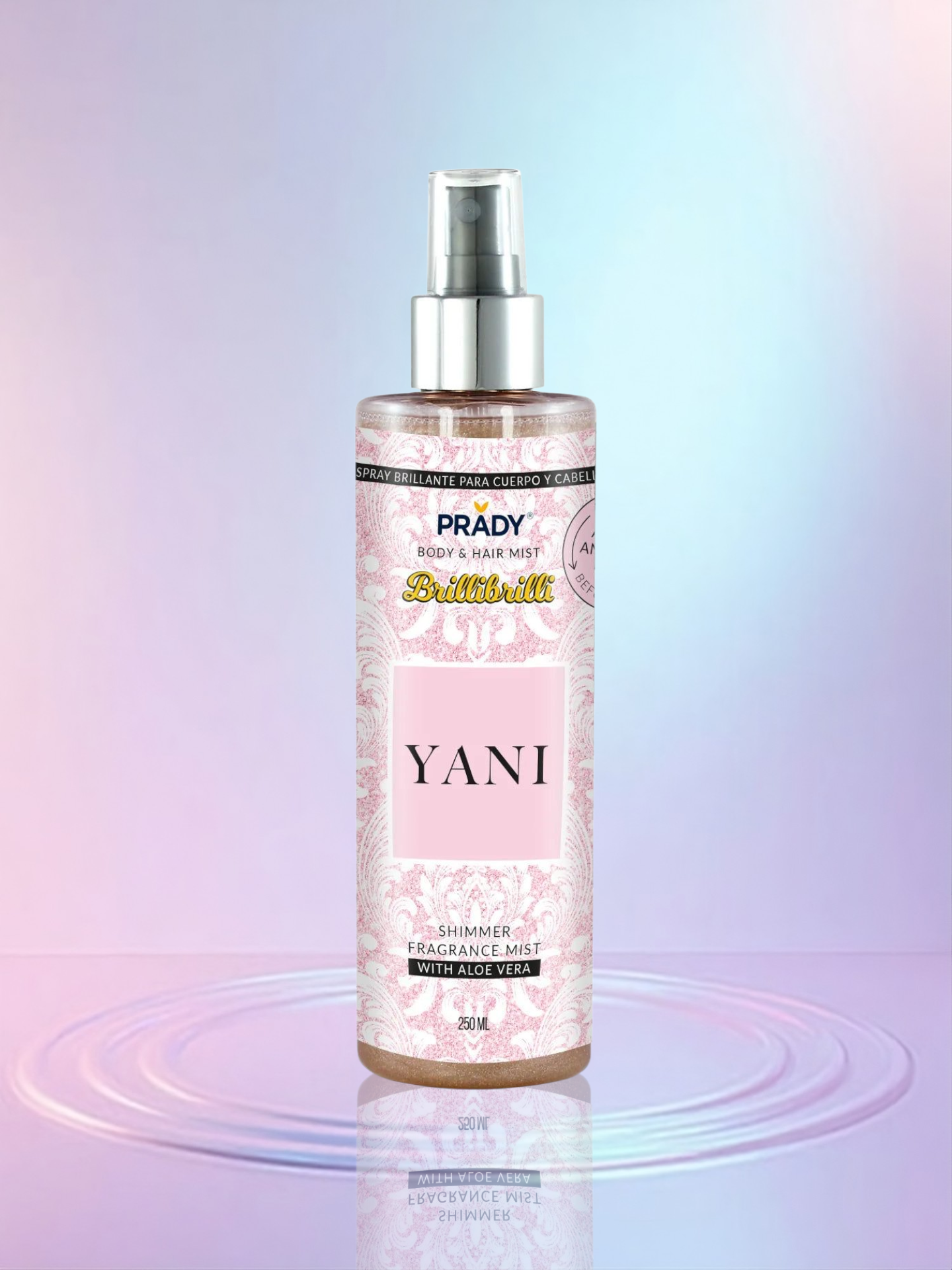Déjate envolver por una brisa de glamour y frescura con la Bruma Brillante “Yani” de Prady. Esta loción corporal y capilar aporta ese brillo que tanto nos gusta, gracias al glitter, y al mismo tiempo cuida tu piel y cabello con aloe vera. Ideal para rociarla después de la ducha, justo antes de salir o en cualquier momento que quieras sentirte radiante.