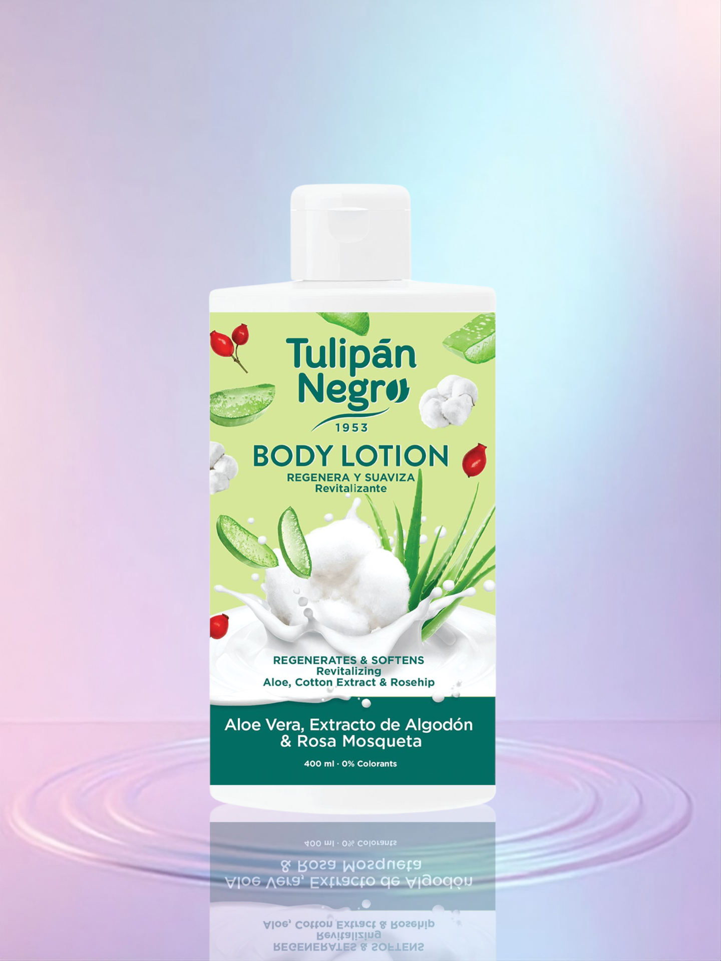¡Descubre el poder de la naturaleza con la Loción Corporal Aloe Vera, Algodón & Rosa Mosqueta de Tulipán Negro! Esta loción está formulada con ingredientes naturales que aportan múltiples beneficios a tu piel.